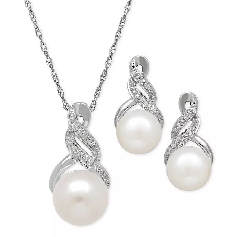 Cultured Freshwater Pearl (8 & 9mm) and Diamond Accent Pendant Necklace and Earrings Set in Sterling Silver or 14k Gold Over Silver
