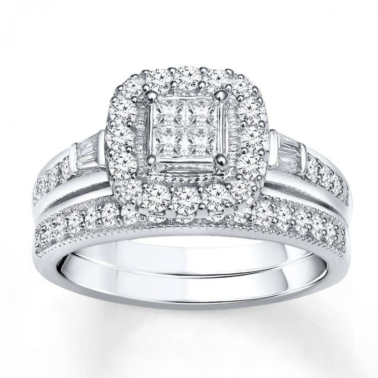 Four tightly nestled princess-cut diamonds form the brilliant center, further framed by sparkling round diamonds, in this fabulous engagement ring Baguette diamonds and channel-set round diamonds line the band, while the matching wedding band features an additional row of round diamonds Crafted of 14K white gold, the bridal set has a total diamond weight of 1/2 carat
