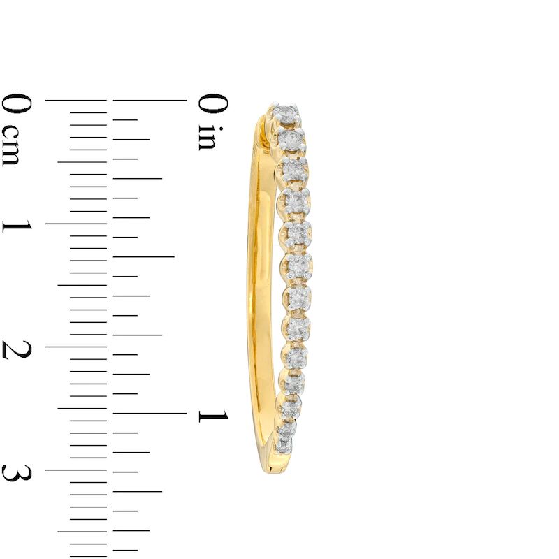 With eye-catching shimmer, these clever diamond hoop earrings are certain to stand out. Crafted in warm 10K gold, each pleasing hoop showcases a row of diamonds graduating in size from largest at the top to smallest at the base. Captivating with 1/2 ct. t.w. of diamonds and a bright polished shine, these earrings secure with hinged backs.