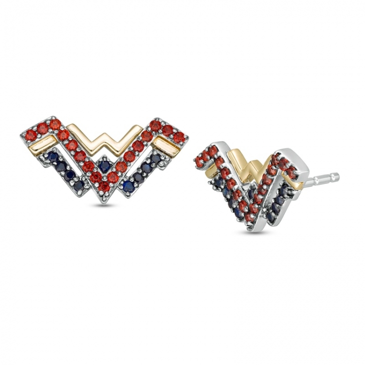 With stunning color, these distinctive gemstone stud earringsdeliver valiant design. Fashioned in sterling silver and warm 10K gold, each dynamic earring showcases the logo in eye-catching silver rows of regal red garnets and bright blue sapphires. A sculpted ribbon in polished yellow gold completes this classic symbol. Buffed to a brilliant luster, these post earrings secure comfortably with friction backs. This exclusive fine jewelry collection inspires you to wear your strength, confidence and power.